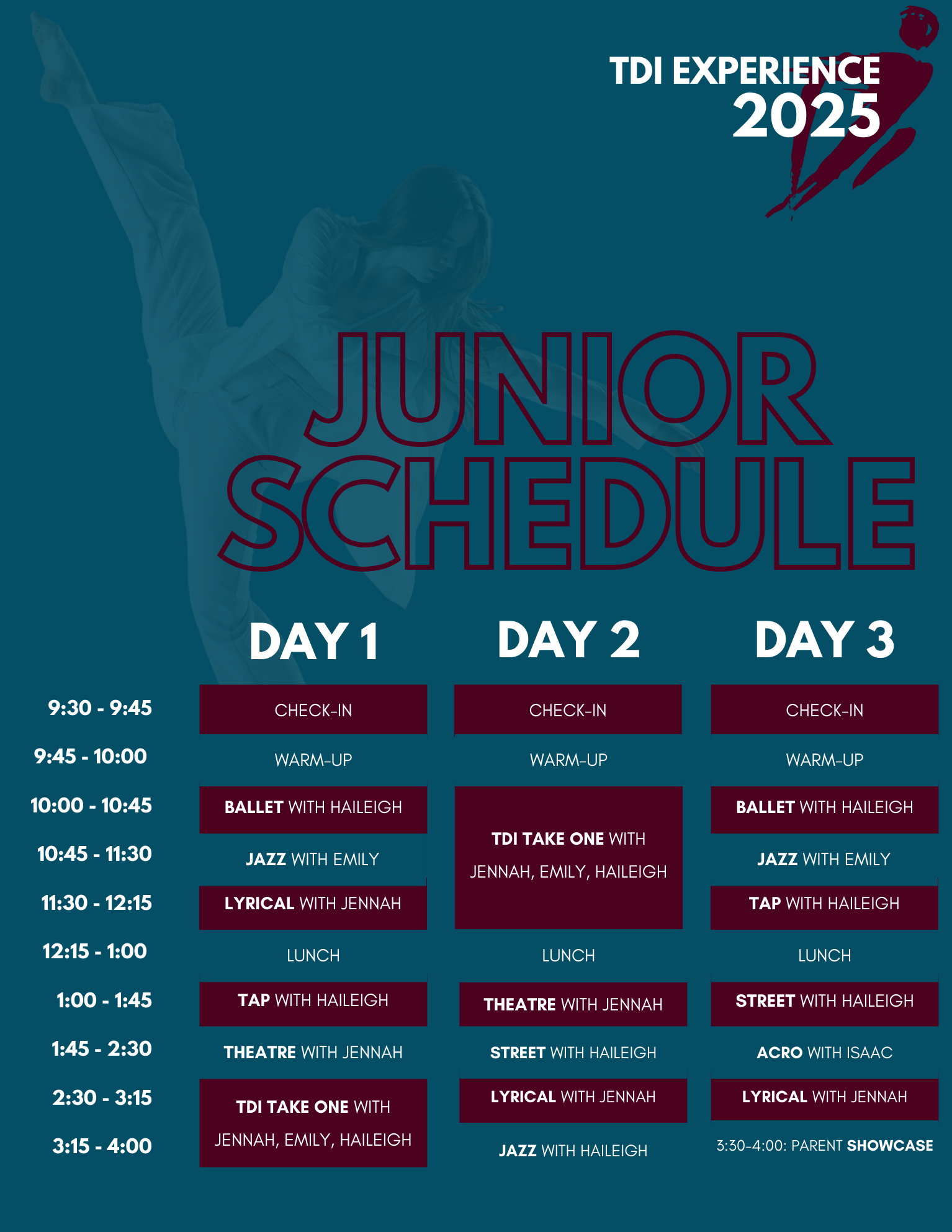 Dancers may be assessed by TDI faculty on Day 1. If we feel a dancer should move levels, we’ll make that call.